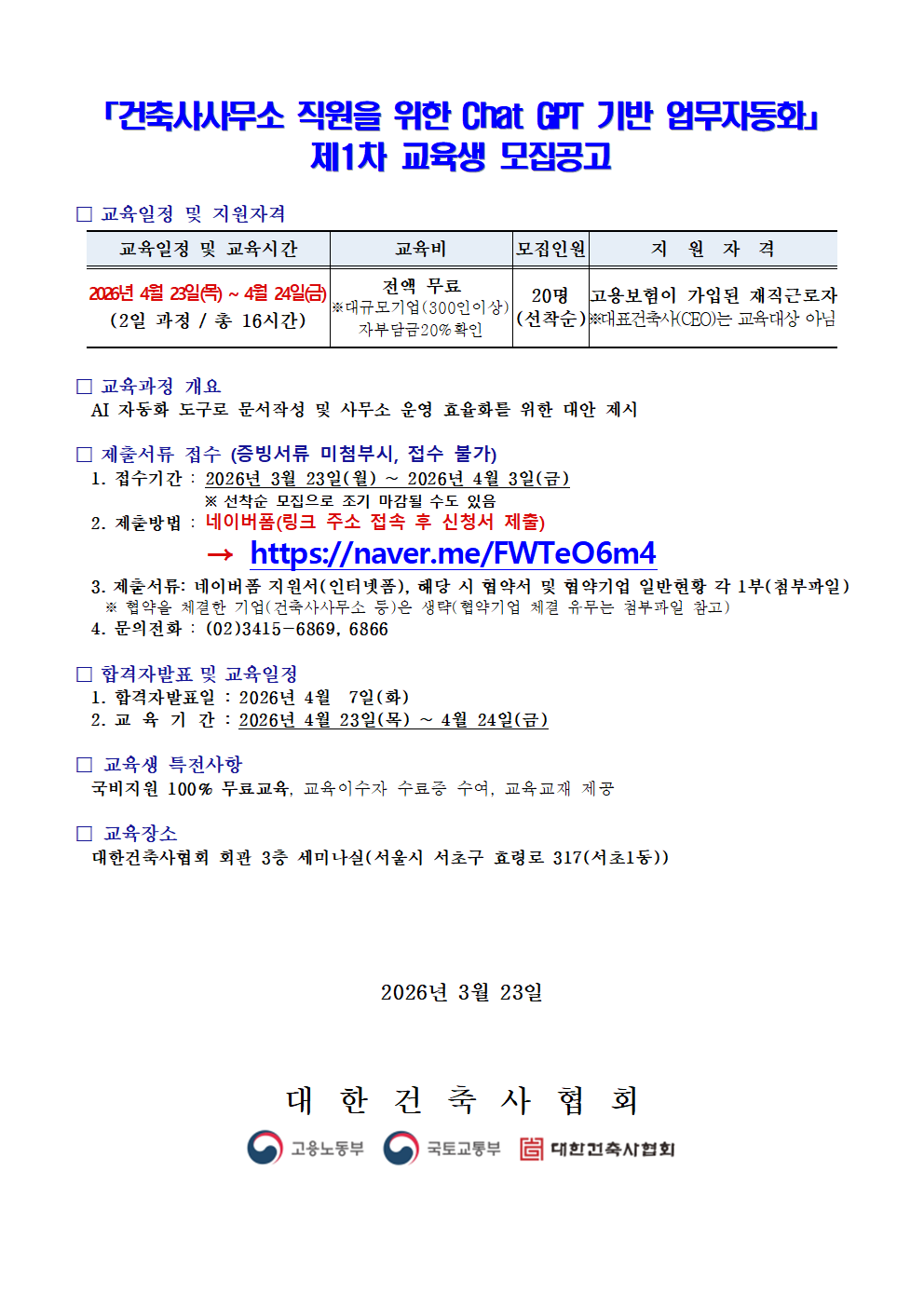 제1차『건축사사무소 직원을 위한 Chat gpt 기반 업무자동화』교육생 모집공고