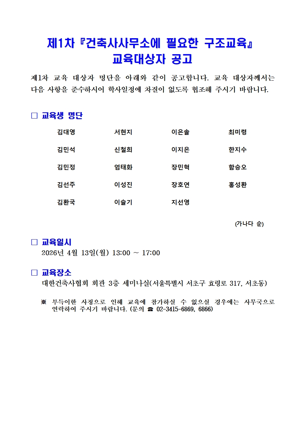 제1차『건축사사무소에 필요한 구조교육』교육대상자 공고