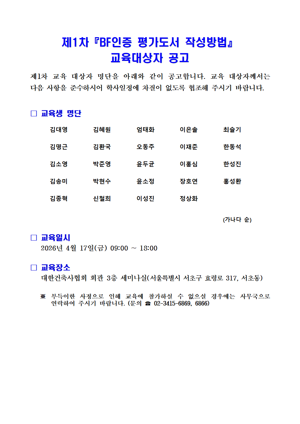 제1차『BF인증 평가도서 작성방법』교육대상자 공고