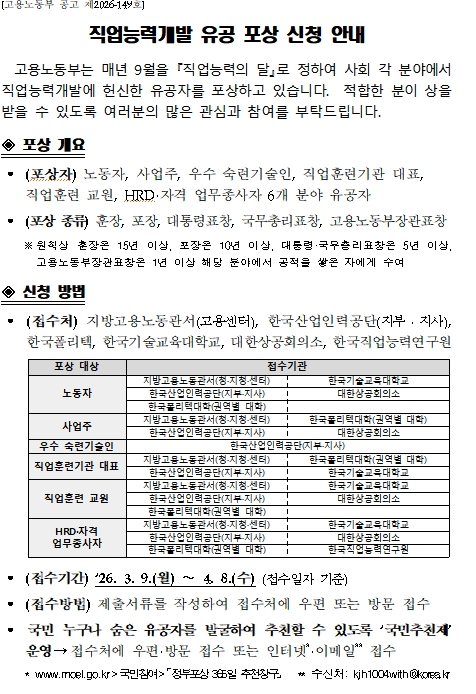 붙임1. 2026년도 직업능력개발 유공 포상계획 안내(공고문)