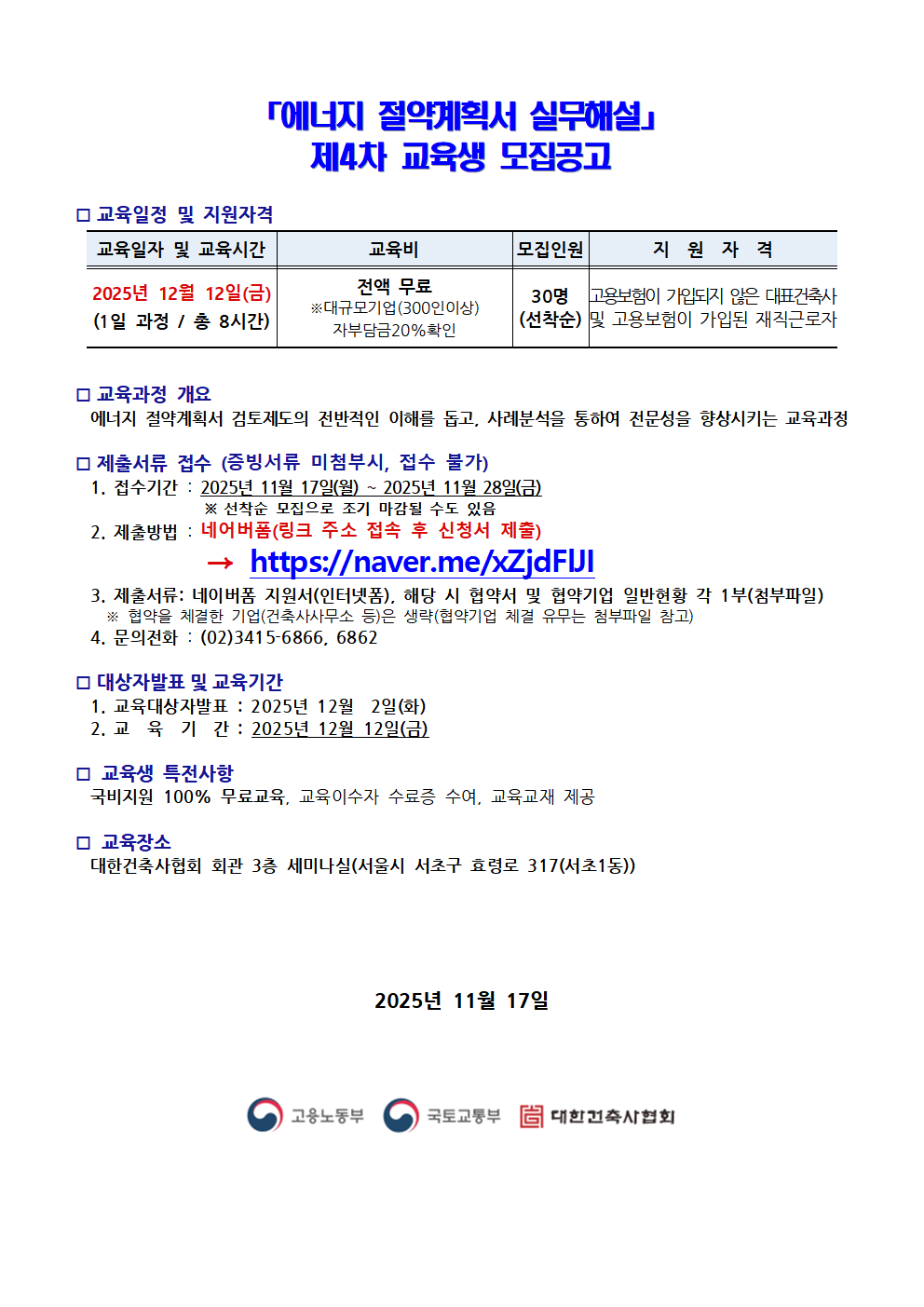 제4차「에너지 절약계획서 실무해설」교육생 모집공고