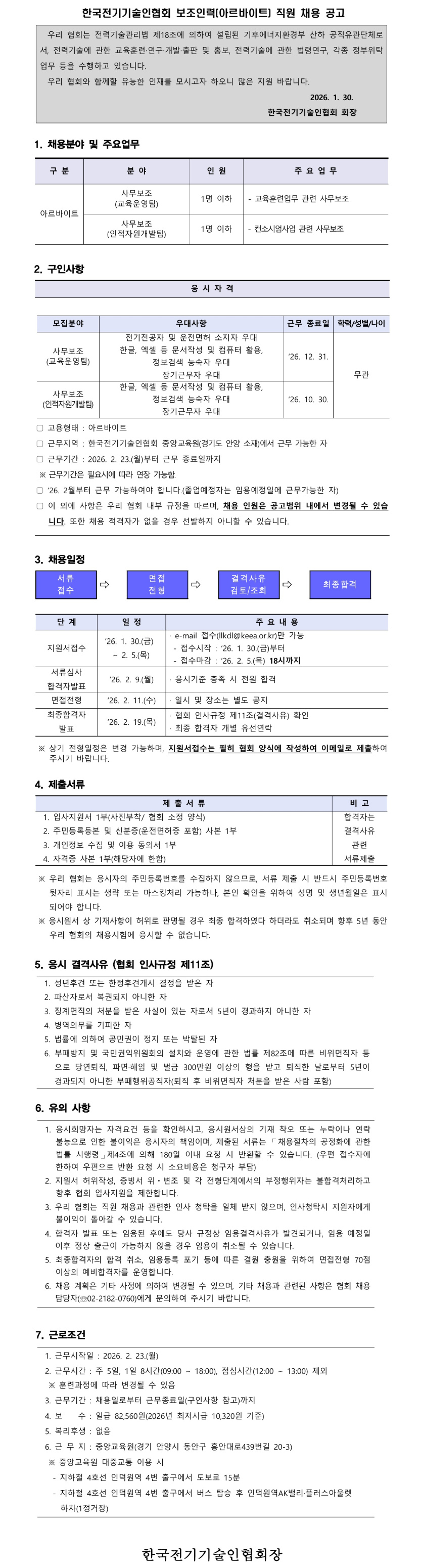 한국전기기술인협회 교육원 보조인력(아르바이트) 채용 공고