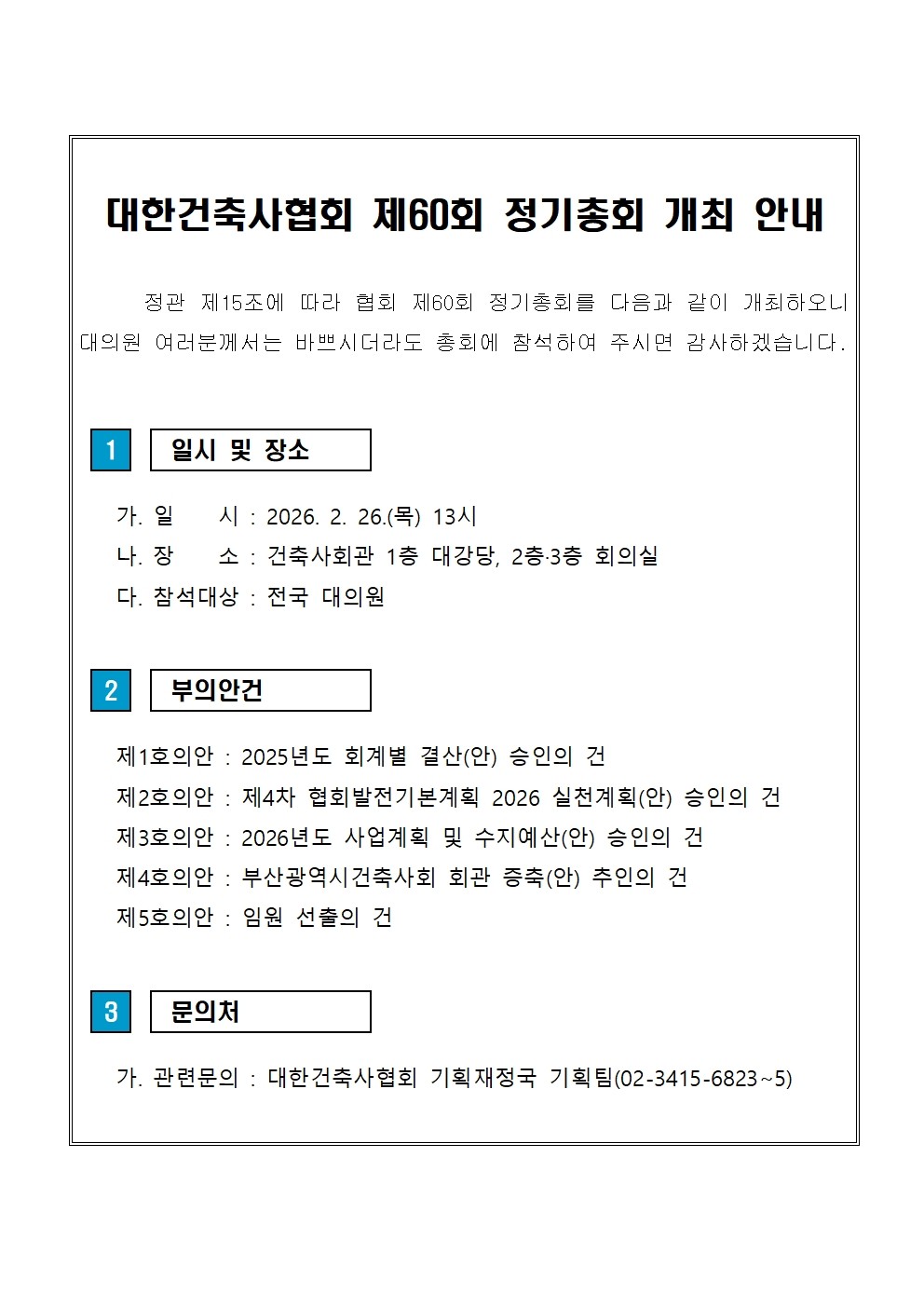 제목 대한건축사협회 제60회 정기총회 개최 안내