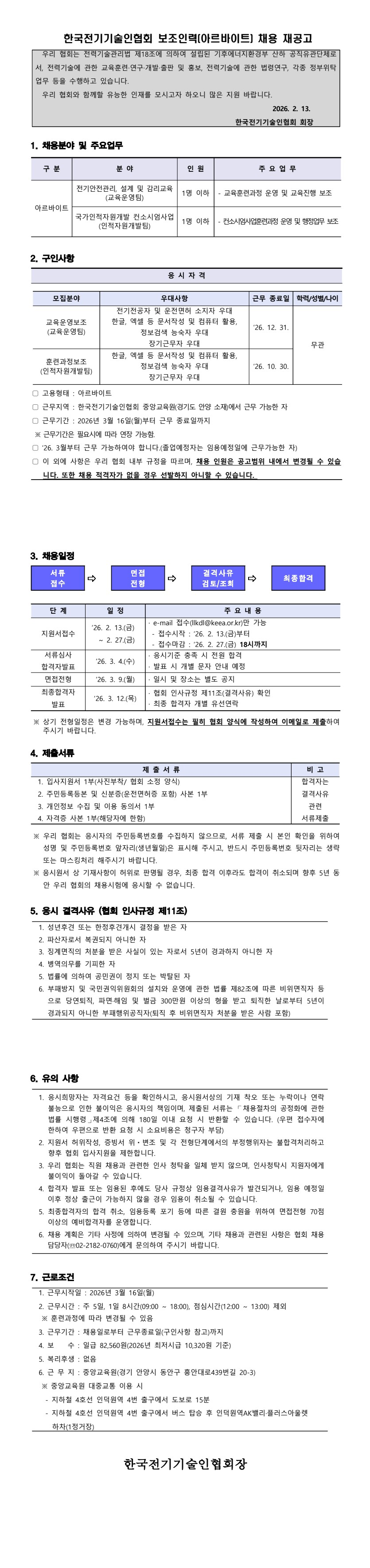 제목 한국전기기술인협회 교육원 보조인력(아르바이트) 채용 재공고
