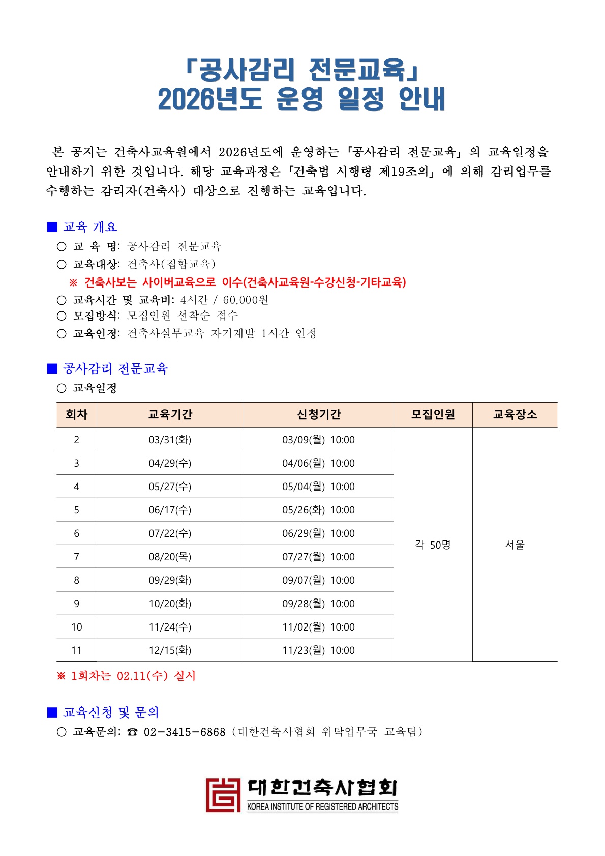 2026년「공사감리 전문교육」운영 일정 안내(건축사 대상)