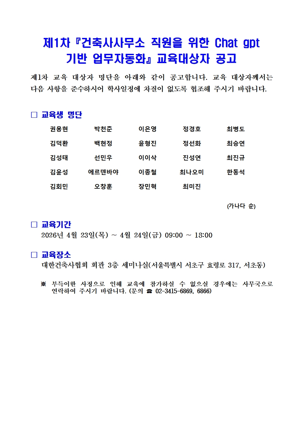 제1차『건축사사무소 직원을 위한 Chat gpt 기반 업무자동화』교육대상자 공고